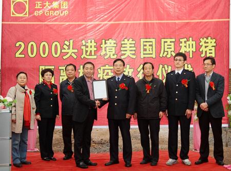 放行儀式上,陜西出入境檢驗檢疫局代表做了檢疫放行報告:“經(jīng)過3個多月的隔離檢驗,正大集團農牧食品企業(yè)(中國區(qū))引進的2000頭原種豬完全符合安全檢疫標準,準予放行?!标兾鞒鋈刖硻z驗檢疫局代表為正大集團陜西區(qū)陳強總裁頒發(fā)了《種豬檢疫合格證書》。