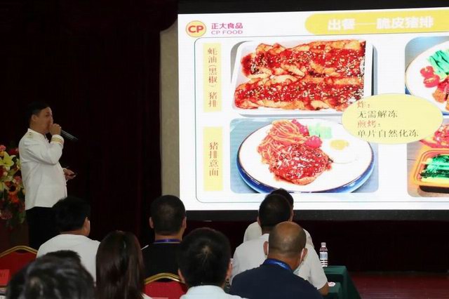注冊中國烹飪大師、洛陽正大食品研發(fā)廚務(wù)總監(jiān)張立新先生向團餐大會介紹了洛陽正大食品開發(fā)的十余款預(yù)制豬肉調(diào)理產(chǎn)品,并從后廚實操角度分享了產(chǎn)品特色和賣點,逐一介紹了出餐加工標準和配餐流程。